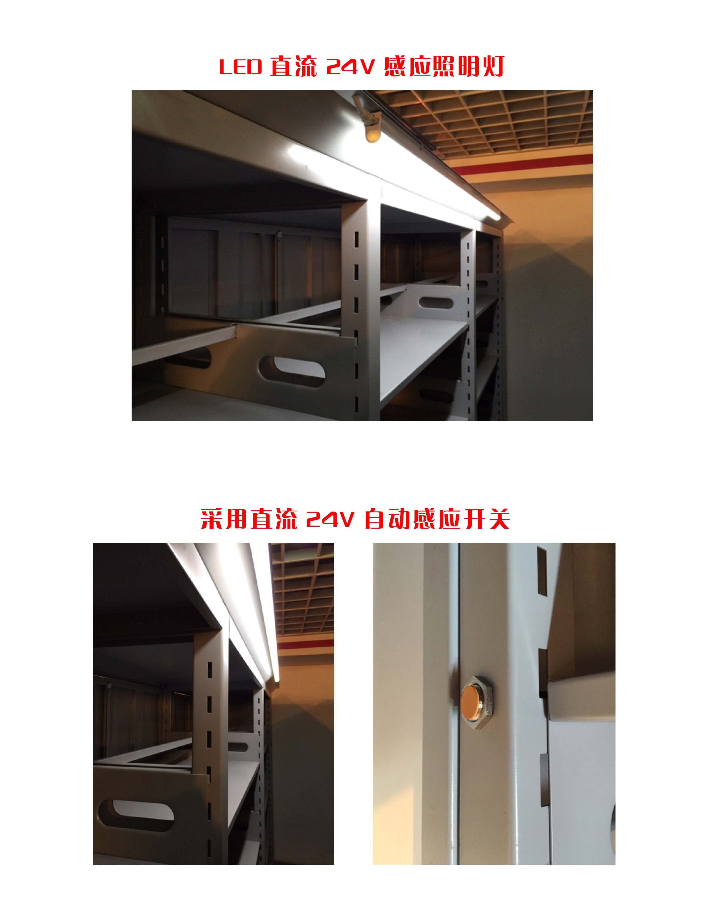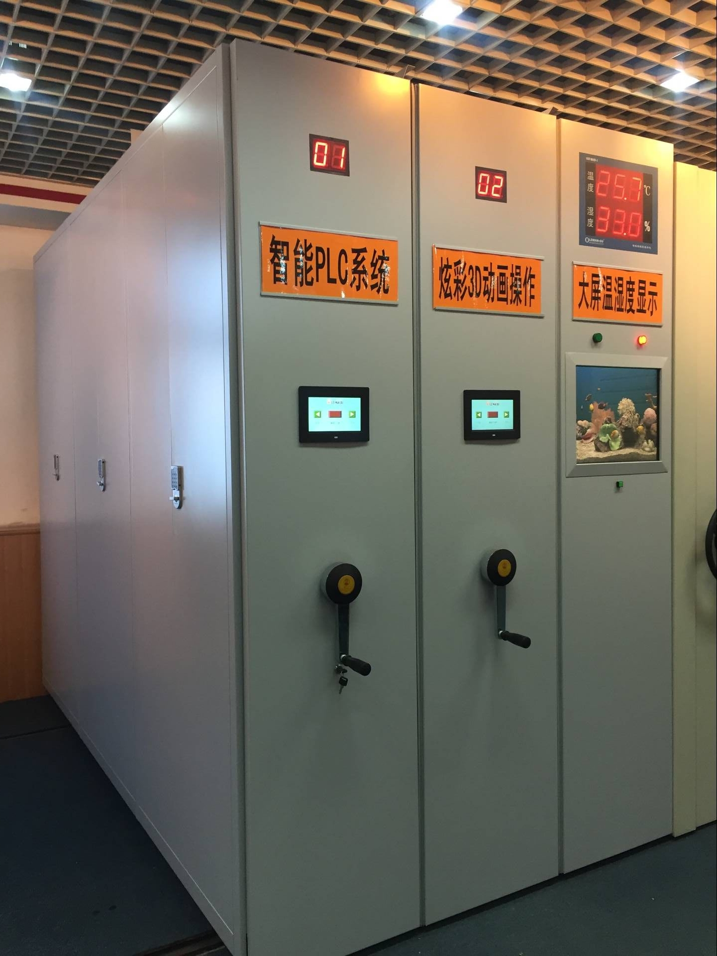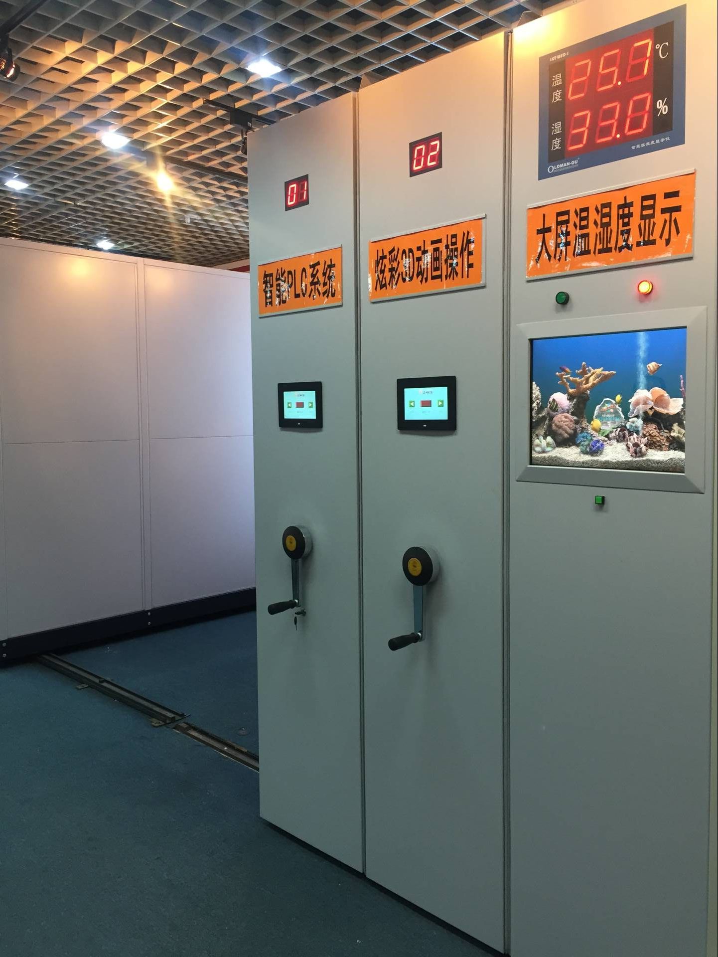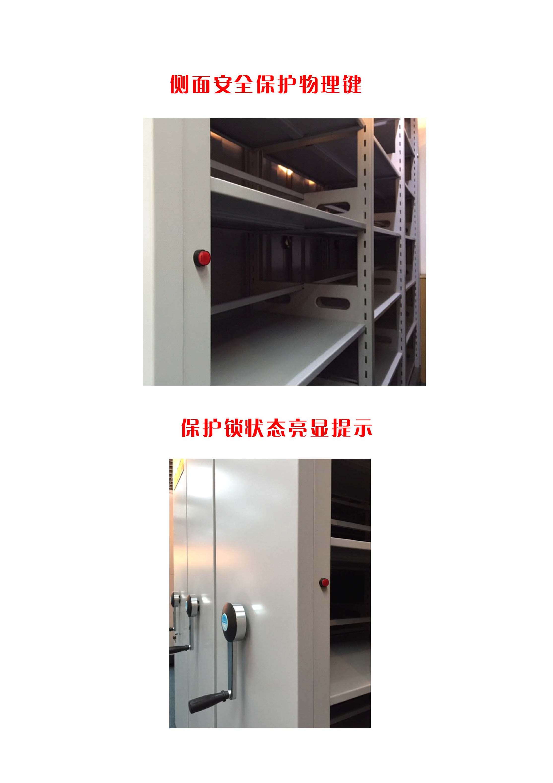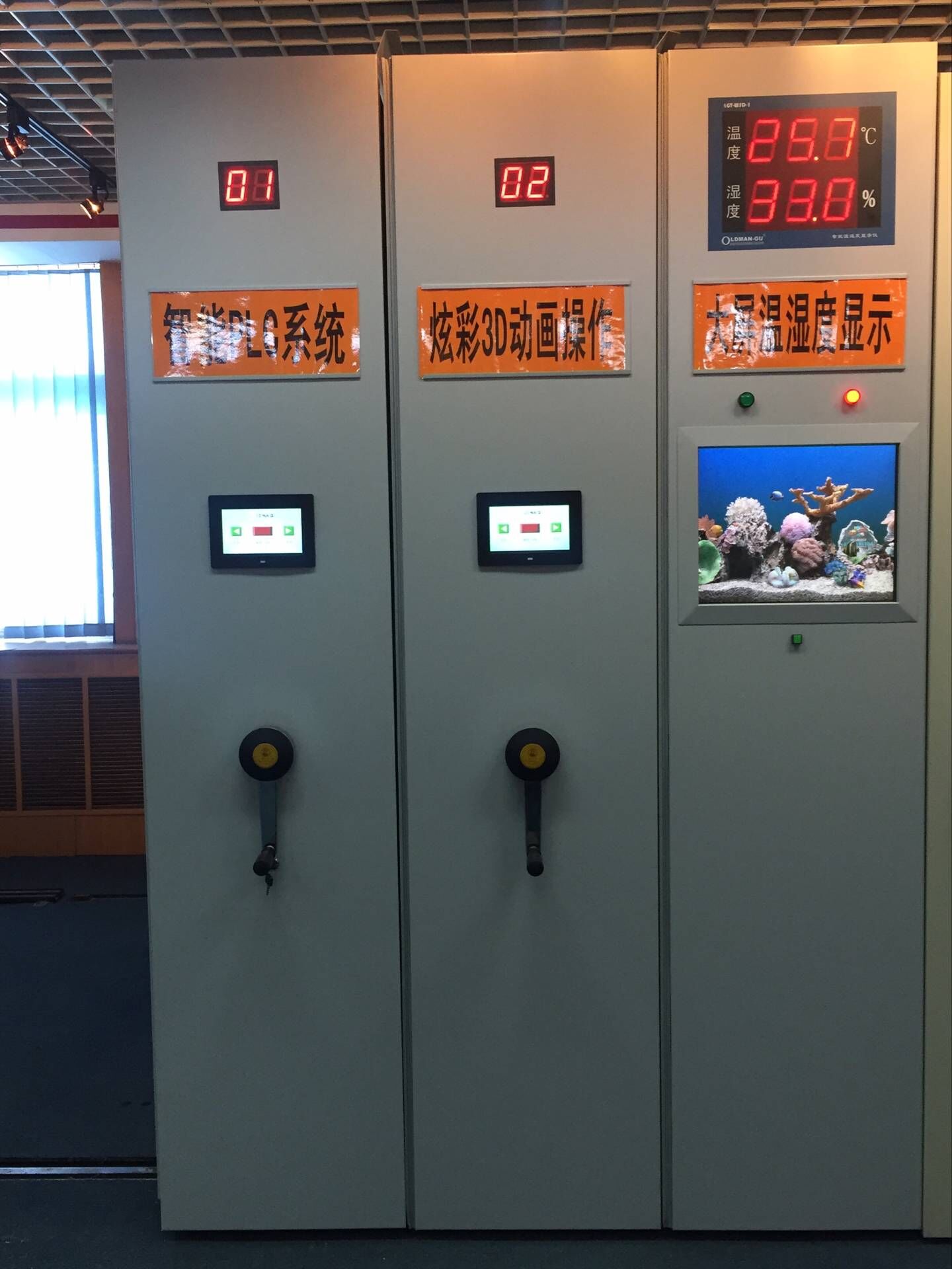 电动功能:手动+电动+遥控器控制+固定列主控屏10.4寸或19寸炫彩液晶显示触摸屏操作+每组活动列安装7寸彩色触摸屏副屏分键盘控制+每列LED数码列标显示+固定列智能温湿度17寸显示仪+固定列Ø22红/绿灯安全保护状态指示灯+每列LED直流24V感应照明灯+每列架体内侧安装物理键+软件设置程序自动封锁通道功能