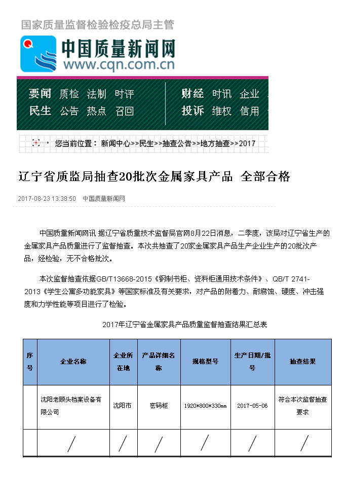 辽宁省质监局抽查20批次金属家具产品全部合格